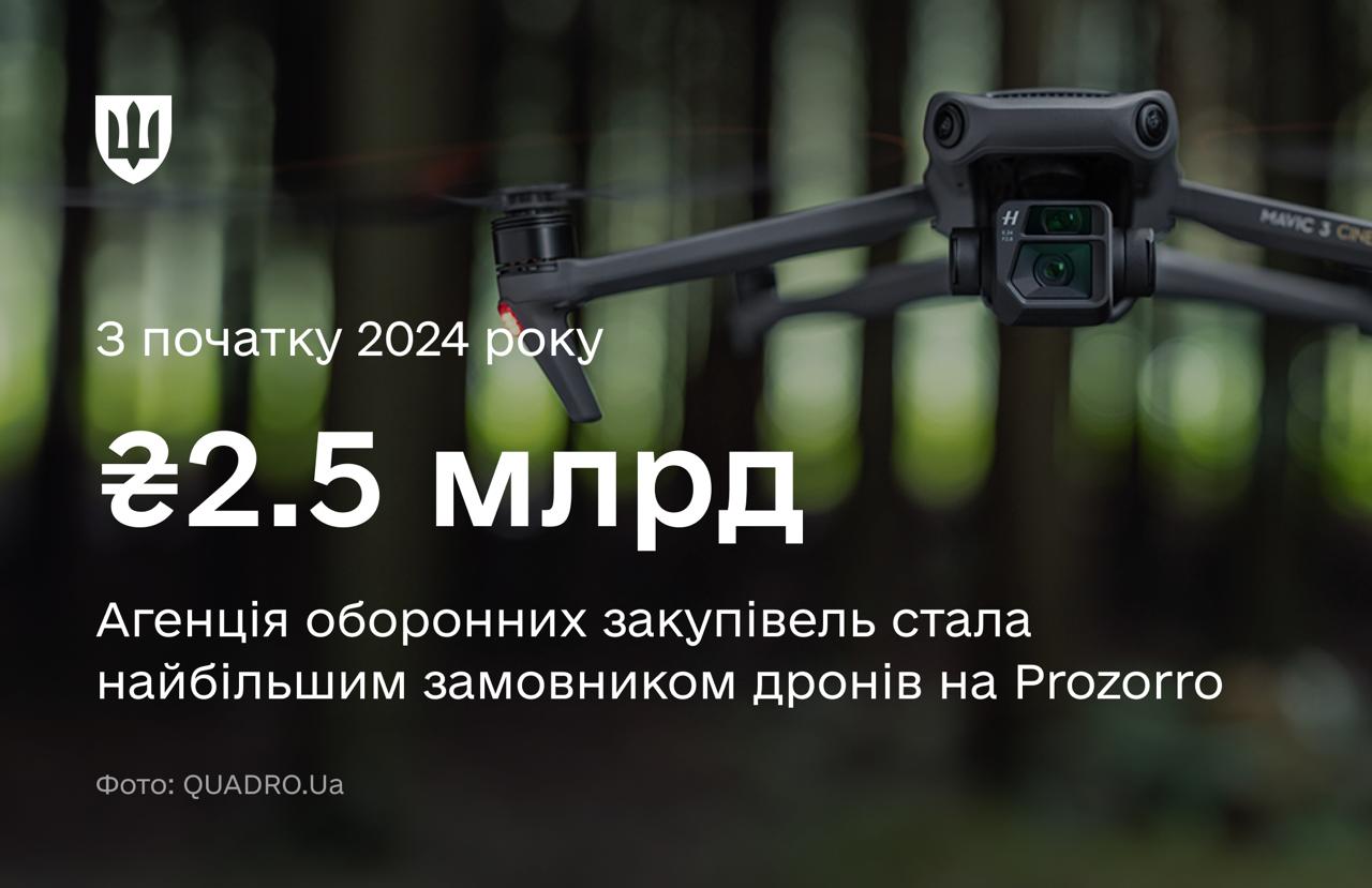 «Агенція оборонних закупівель» Міністерства оборони України є найбільшим замовником безпілотників у системі Prozorro. За даними електронної системи публічних закупівель, з початку 2024 року через конкурентні торги було закуплено дрони DJI Mavic 3E та 3T на суму 2,5 млрд грн. Цей показник становить понад 40% від загальної суми угод на дрони у конкурентних закупівлях на Prozorro.